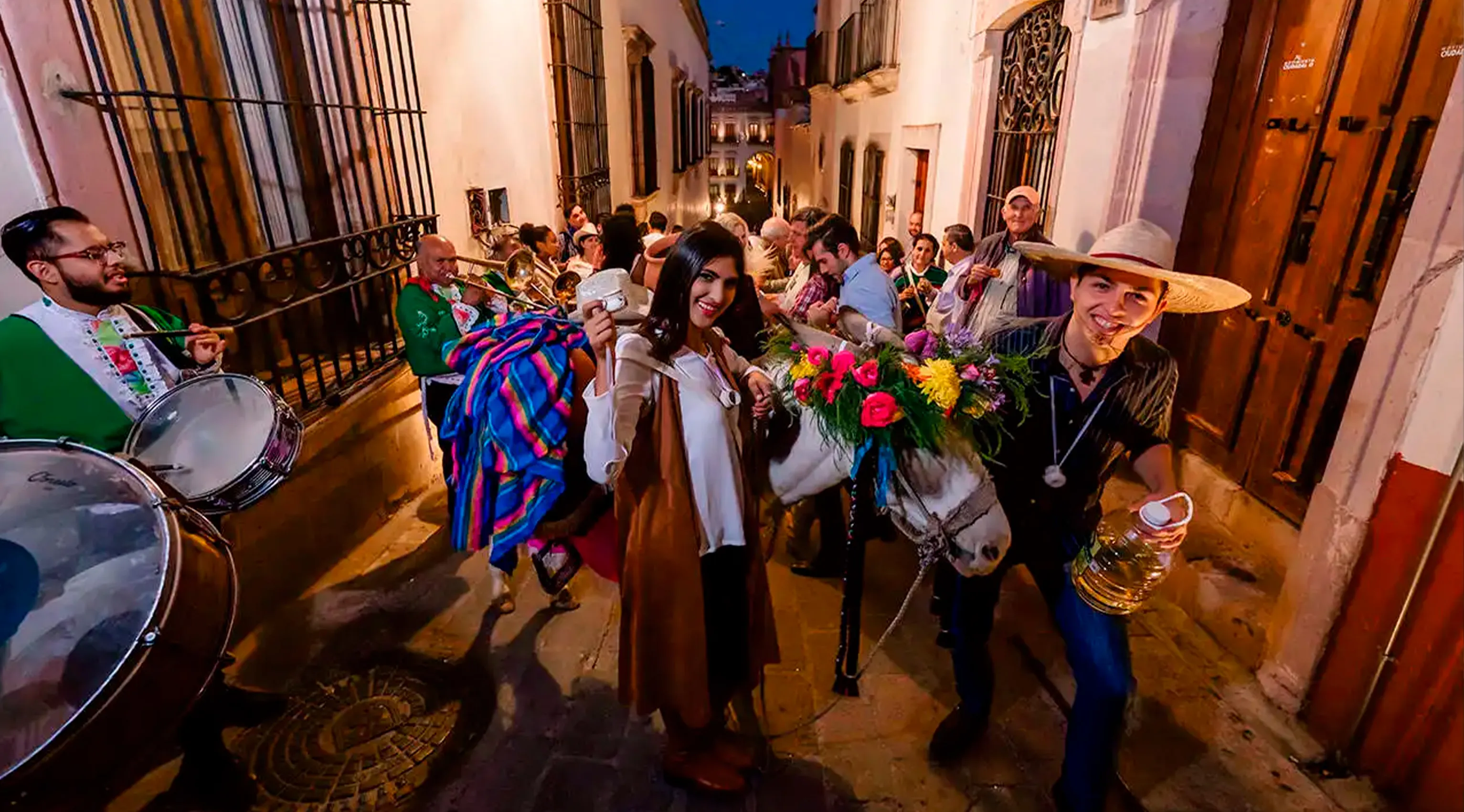 Una experiencia única para disfrutar el centro histórico, recorriendo sus iluminados callejones, calles y plazuelas al son alegre del tamborazo zacatecano y acompañados del burrito que carga el mezcal. Qué mejor manera de escuchar “La marcha de Zacatecas” y otros ritmos, cada vez más animados, que hacen que el cuerpo y el alma bailen en las plazas para rematar con una verbena.